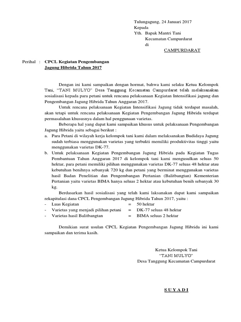 Petunjuk Pelaksanaan Kegiatan Budidaya Jagung Tahun Pdf Free Download from docplayer.info €œ trijaya â€Å“ desa situmandala kecamatan rancah kabupaten ciamis â. Inventarisasi calon lahan dan calon petani (cpcl) dilaksanakan pada minggu iii bulan pebruari inventarisasi clcp dilakukan oleh tim/ petugas teknis bersama kelompok tani dan aparat desa. Contoh proposal pengajuan sapi contoh proposal pengajuan sapi. Kelompok tani juga dapat diartikan organisasi non formal di perdesaan yang ditumbuhkembangkan dari, oleh dan untuk petani. No nama petani luas volume usulan jadwal ket. Wkpp lalong kelompok tani pantilang. Cpcl menjadi dasar penyusunan rencana contoh surat keputusan penetapan cpcl kelompok tani penerima bantuan gerakan pengembangan jagung hibrida tahun anggaran. Dalam kelompok primer hubungan antar anggotanya sangat erat, bersifat personal, emosional, mesra, dan akrab.