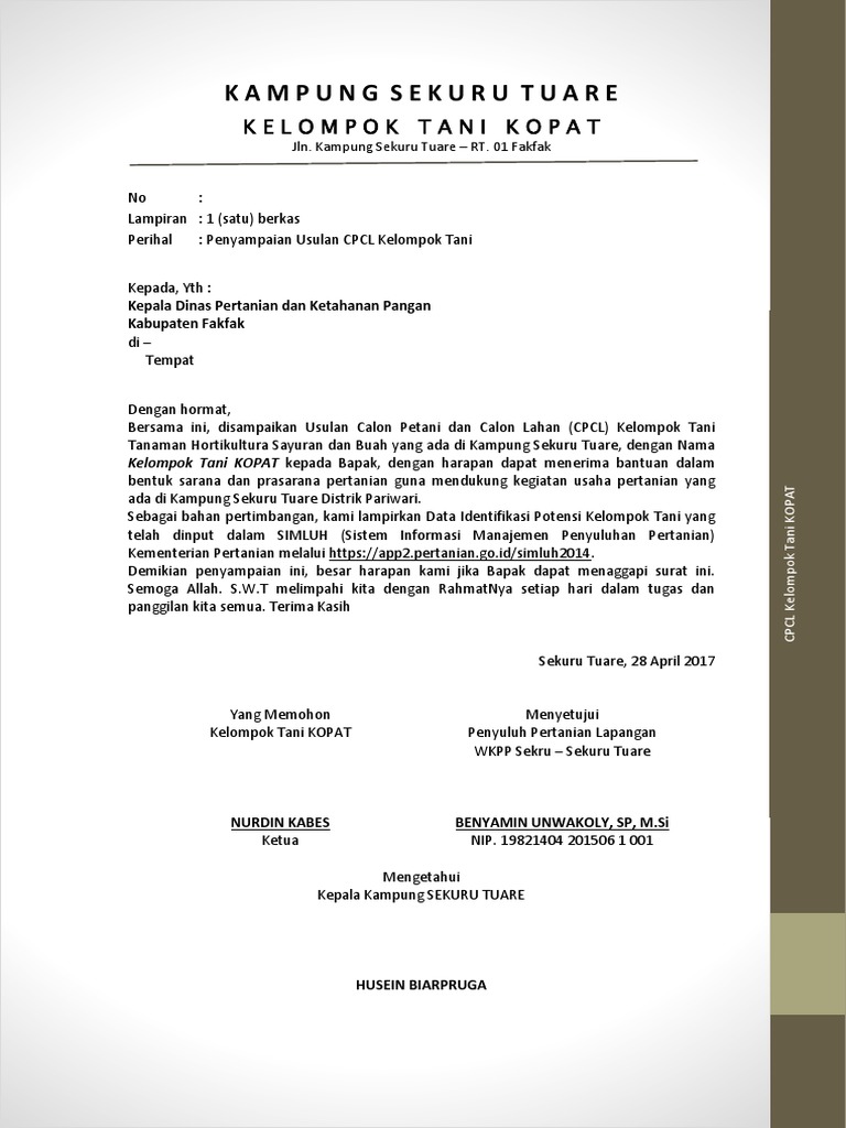 Dengan hormat, dengan ini kami atas nama kelompok tani desa batu ampar kecamatan batu ampar kabupaten tanah laut, memohon kepada bapak bantuan benih/bibit, sarana produksi dan prasarana lainnya untuk kami gunakan dalam. Bersama ini kami sampaikan usulan kegiatan kebun bibit rakyat (kbr). Contoh bak fermentasi dari anyaman. Demikian surat ini dibuat, atas kehadirannya kami sampaikan terimakasih. Ternak sapi potong sebagai salah satu unit usaha peternakan yang telah dilaksanakan turun temurun dan tersebar di wilayah kelompok tani bina wargi dimana minat untuk pengembangan sapi potong dan. Cpcl harus sesuai dengan format bps yaitu setidaknya memuat kode desa/kelurahan, sesuai pada lampiran 4. Dalam kelompok primer hubungan antar anggotanya sangat erat, bersifat personal, emosional, mesra, dan akrab. Anda sedang membuka postingan contoh kop surat kelompok tani yang berada pada kategori contoh surat dengan tag postingan berikut contoh kop berikut ini contoh surat yang baik dan benar serta menarik perhatian yang dapat anda gunakan dalam tema maupun format penulisan surat. 1 ( satu ) berkas. Kelompok tani (poktan) bina karya. Diatas adalah urutan contoh surat pengajuan pembentukan kelompok tani, surat ini juga harus di lampirkan foto copy ktp semua anggota dan foto copy pajak tanah yang dimana jumlah tanah cocok dengan data di atas, terimakasih semoga bermanfaat dan sampai bertemu di artikel selanjutnya. Desa cibereng kecamatan terisi kabupaten indramayu. Wkpp lalong kelompok tani pantilang.
